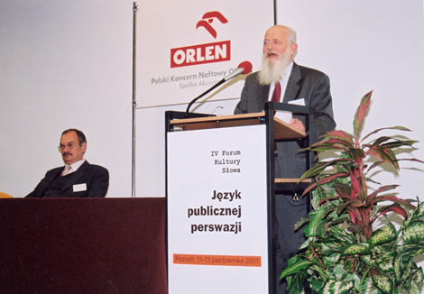 Jak już wspomniałem, na program IV Forum złożyło się dziewięć referatów i dwie dłuższe dyskusje („spotkania panelowe”) poprzedzone wprowadzającymi wypowiedziami. Uczestników witał prorektor UAM (prof. Bogdan Walczak), rektor SWJO (prof. Tadeusz Zgółka), prezes TKJ (prof. Józef Porayski-Pomsta) oraz oczywiście przewodniczący Rady Języka Polskiego, prof. Andrzej Markowski. Program naukowy rozpoczął się od referatu Walerego Pisarka („Perswazja: jak ją widzą, jak ją piszą”), prezentującego różne, głównie językoznawcze, ale i komunikologiczne spojrzenia na perswazję, jej istotę, środki, zakres i rolę społeczną. Naturalnym uzupełnieniem tego wstępu do konferencji okazał się następny referat Mirosławy Marody („Socjologiczne zaplecze języka perswazji publicznej”); jej zdaniem warunkiem zaistnienia rzeczywistej perswazji jest dialog, bez którego nie może być mowy o faktycznych negocjacjach, o przekonywaniu świadomego adresata, a więc o perswazji we właściwym znaczeniu tego słowa. Później w dyskusji ujawnił się pogląd przeciwny, że perswazja pojawia się tam, gdzie występuje „blokada weryfikacji sądu”.