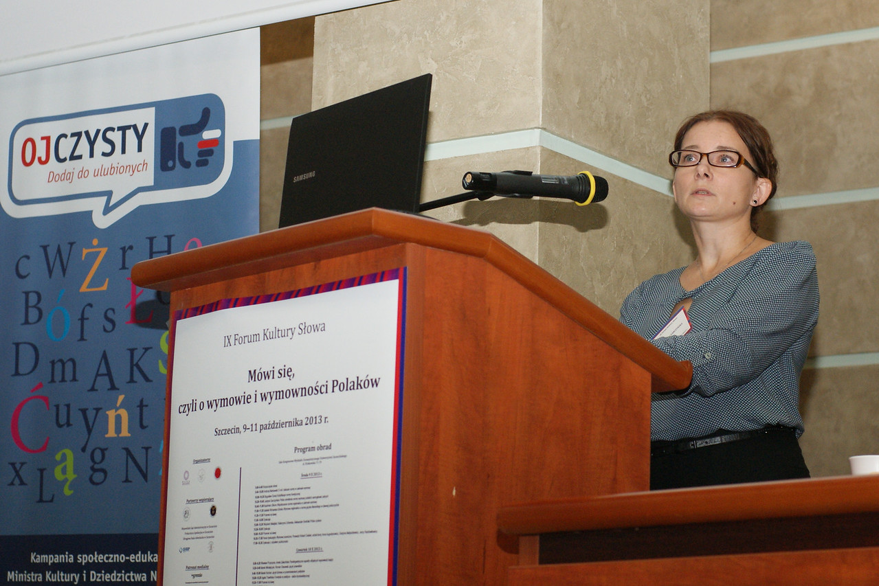 Kolejna referentka, Justyna Garczyńska, podjęła próbę określenia normy wymowy polskich samogłosek ustnych. Celem wystąpienia była charakterystyka tych kontekstów fonetycznych, które powodują istotne statystycznie i regularne modyfikacje barwy polskich samogłosek ustnych. Jak zaznaczyła prelegentka, z punktu widzenia fonetyki interesujący jest stosunek percepcji słuchowej do rzeczywistego brzmienia głosek. Jest bowiem wiele czynników, które wpływają na różnice w zapisach dokonanych na podstawie odbioru słuchowego tego samego tekstu, wypowiedzianego przez kilka osób. Uwzględnia się nie tylko takie czynniki, jak przypadkowa niedyspozycja zapisującego, przesłyszenie się czy autosugestia, lecz także samą strukturę akustyczną samogłosek. Autorka podkreśliła, że dla rozpoznawania samogłosek najistotniejsze są częstotliwości dwóch pierwszych formantów F1 i F2. W przeprowadzonych przez siebie badaniach skupiła się więc na pokazaniu, w jaki sposób częstotliwość tych dwóch formantów wpływa na cechy artykulacyjne samogłosek. Referentka zwróciła też uwagę na trudności w ustaleniu cech samogłosek ustnych. Słuchającemu może się wydawać, że ta sama samogłoska wypowiedziana kilkukrotnie za każdym razem brzmi tak samo. Pomiary częstotliwości dwóch pierwszych formantów wykazują jednak pewien rozrzut wartości w kolejnych powtórzeniach danego wyrazu. Nawet identyczne słuchowo samogłoski mogą się zatem różnić wartością akustyczną. W dalszej części referatu Justyna Garczyńska – na podstawie własnych szczegółowych badań – pokazała zależności między częstotliwościami obu formantów i cechami artykulacyjnymi samogłosek.