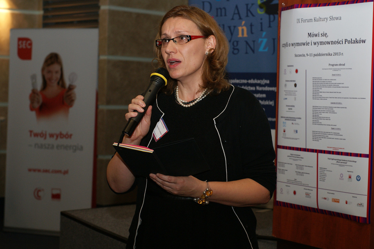 Ostatnią prelegentką IX Forum Kultury Słowa była Jolanta Tambor, która wygłosiła referat zatytułowany Polskie dźwięki w cudzoziemskich ustach. Cudzoziemcy w polskich mediach. Językoznawczyni próbowała odpowiedzieć na pytanie, jak postrzegana jest wymowa polskich słów przez obcokrajowców i w jaki sposób ukazują ją media. Jolanta Tambor podała przykłady takich właściwości polszczyzny, które sprawiają szczególną trudność osobom uczącym się naszego języka. Jej zdaniem największe kłopoty sprawiają dwa rodzaje głosek. Po pierwsze, głoski szumiące, występujące często w trudnych do wymówienia grupach spółgłoskowych. Po drugie, osobom uczącym się polskiego trudność sprawia wymowa samogłosek. Dotyczy to przede wszystkim samogłosek szeregu przedniego, zwłaszcza wysokich: [i], [y], występujących w podobnych formach, np. byłem i biłem. Stereotypy związane z postrzeganiem wymowy polskich słów przez cudzoziemców referentka omówiła na przykładzie wybranych reklam telewizyjnych. Według jej obserwacji najczęściej mamy do czynienia z dwoma sposobami ukazywania wymowy obcokrajowców. Pierwszy polega na humorystycznym uwydatnieniu ich kłopotów z wymową. Cudzoziemcom przypisuje się przy tym często takie rodzaje błędów, których ci faktycznie by nie popełnili, a które odpowiadają jedynie uogólnionym wyobrażeniom na temat ich wymowy. Drugi sposób można zaobserwować np. w reklamach, w których wymowa ma wzbudzać pozytywne odczucia u widza. Jeśli bowiem wysoko oceniamy kompetencje danej osoby, to również jej wymowę (z wyraźnymi naleciałościami obcymi) traktujemy z sympatią. Prelegentka zauważyła też, że nasza skłonność do żartowania z wymowy cudzoziemców sprawia, że często nie doceniamy ich kompetencji językowych.