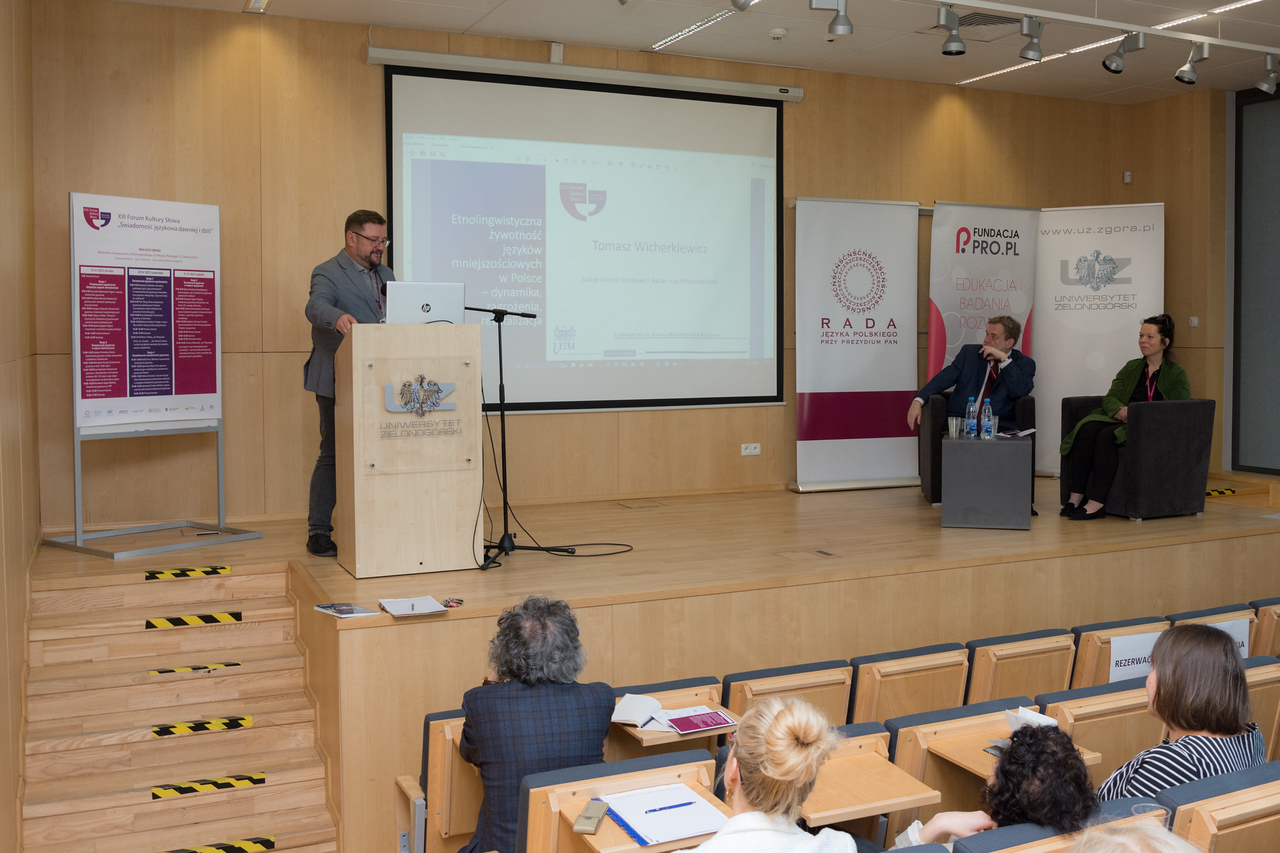 Trzeci referent V sesji obrad, prof. Tomasz Wicherkiewicz, omówił zagadnienie etnoligwistycznej żywotności języków mniejszościowych w Polsce. Autor postawił tezę, że dynamika zmian w statusie, prestiżu i korpusach tych języków skutkuje zmiennym (na ogół rosnącym) stopniem ich zagrożenia zmianami ilościowymi (np. demograficznymi) i jakościowymi (niektóre aspekty planowania językowego), które znacząco wpływają na tożsamość, kompetencje językowe i dobrostan poszczególnych użytkowników i ich społeczności.