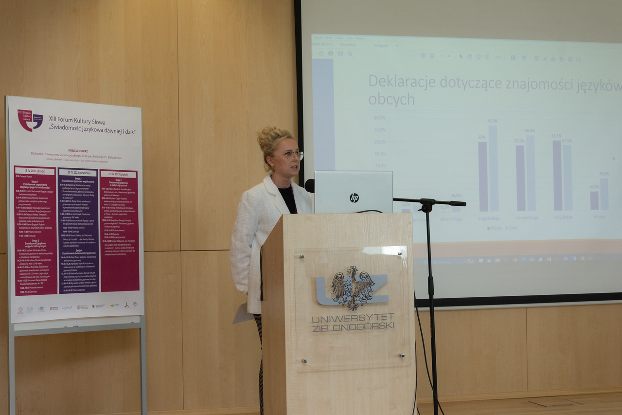 Kolejna referentka, prof. Ewa Kołodziejek, omówiła rolę poradni językowych, rubryk prasowych, programów radiowych i telewizyjnych, a także różnorodnych form poradnictwa internetowego w budzeniu świadomości językowej.